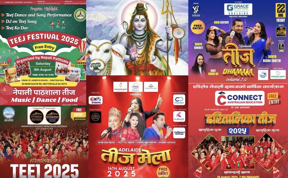 यसै क्रममा साउथ अष्ट्रेलियाको एडिलेडमा अगष्ट ९ शनिवार मा नेपाली पाठशालाले तिज गर्ने भएको छ । स्थानिय सेन्टसोसेफ स्कुल, हेक्टरभिलमा साझ ५ बजेबाट कार्यक्रम शुरु हुने पाठशालाका प्रचार्य चन्द्र मणी पाण्डेले बताए । उनले चेलिबेटीहरुलाई नेपाली मौलिक गित संगितको साथमा नेपाली परिकारको समेत व्यवस्था गरिएको बताए ।![]()