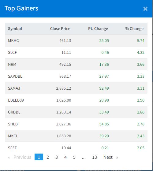बुधबार मायाखोला हाइड्रोपावरको सेयरमूल्य सर्वाधिक अंकले बढेकाे छ । आज कम्पनीको सेयर ५.७४ प्रतिशतले बढेकाे छ । त्यस्तै, यस दिन सानिमा लार्ज क्याप फण्ड, नेपाल रिपब्लिक मिडिया, सप्तकोशी डेभलपमेन्ट बैंक, समाज लघुवित्त, ग्रीन डेभलपमेन्ट बैंक लगायतको सेयरमूल्य बढेकाे छ ।