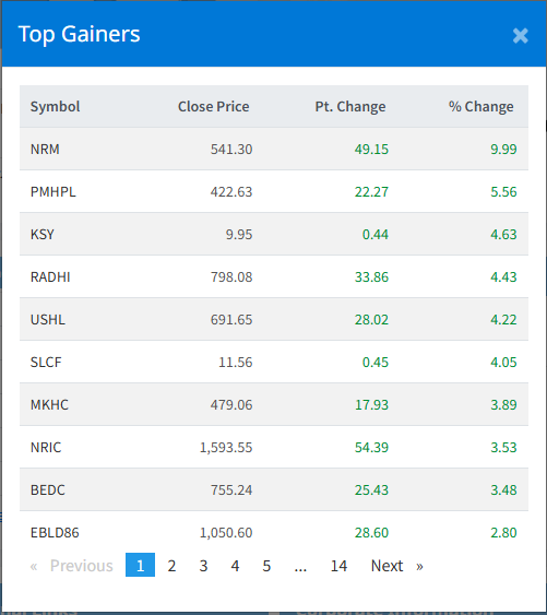 यस दिन नेपाल रिपब्लिक मिडियाको सेयरमा सकरात्मक सर्किट लागेकाे छ । त्यस्तै, यस दिन पञ्चकन्या माइ हाइड्रोपावरको सेयरमूल्य ५.५६ प्रतिशत, कुमारी सबल योजनाको सेयरमूल्य ४.६३ प्रतिशत, राधि विद्युत कम्पनीको सेयरमूल्य ४.४३ प्रतिशत र अप्पर स्याङ्गे हाइड्रोपावरको सेयरमूल्य ४.२२ प्रतिशतले बढेकाे छ ।