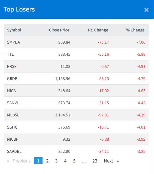 यस दिन सम्पदा लघुवित्तको सेयर मूल्य सर्वाधि घटेको छ । कम्पनीको सेयरमूल्य यस दिन प्रतिकित्ता ७.०६ प्रतिशतले घटेको हो । त्यसैगरी, यस दिन ट्रेड टावर लिमिटेडको ५.८८ प्रतिशत, प्रभु स्मार्ट फण्डको ४.९१ प्रतिशतले सेयर मूल्य घटेको छ ।