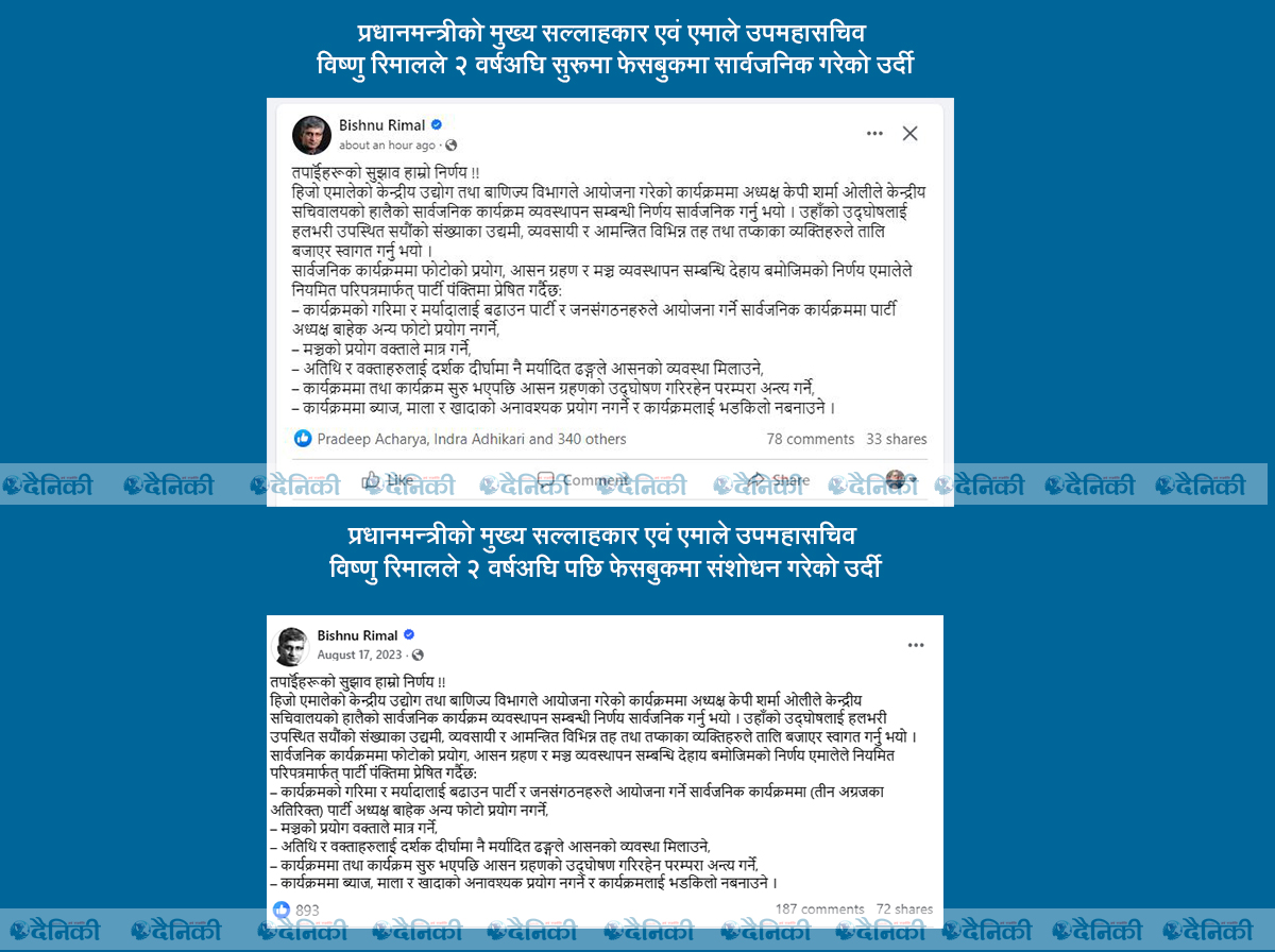यता निर्णयको चर्को आलोचना भएपछि प्रधानमन्त्रीको मुख्य सल्लाहकार समेत रहुन भएको एमाले उपमहासचिव विष्णु रिमालले आफ्नो फेसबुक मार्फत जारी गरेको उर्दीमा पनि अध्यक्ष बाहेकको कसैको फोटो नराख्ने भन्ने निर्णयमा तीन नेताको बाहेक भनेर फेसबुकको पोष्टमै संशोधन राख्नुभयो ।