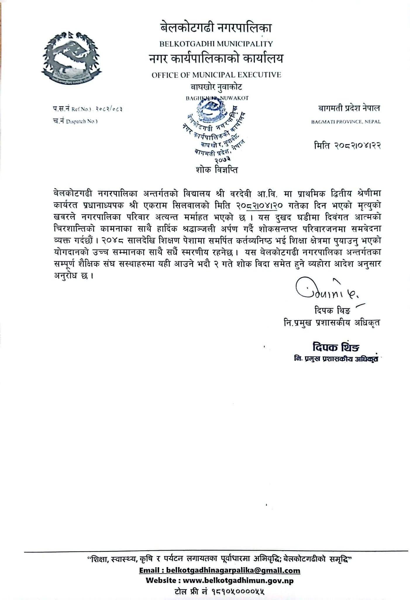 आत्महत्या गरेको शिक्षकको अन्त्येष्टिको १४ दिनमा नगरपालिकाले कस्तो शोक मनाउन खोजेको हो भनेर प्रश्न उठेको छ । सामान्यतया शोकविदा मृत्युको दिन वा भोलिपल्ट दिने प्रचलन हुन्छ । तर बेलकोटमा शिक्षकको आत्महत्याको समयमा विद्यालयहरू बन्द रहेका कारण भदौ २ गते विद्यालय खुलेको दिन विदा दिने आदेश जारी भएको छ ।