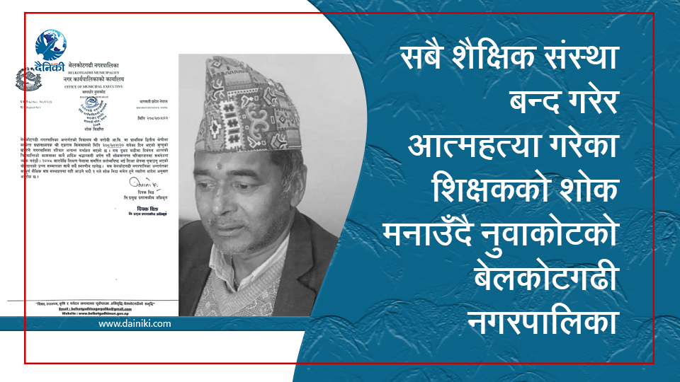 २ भदौ, नुवाकोट । नुवाकोटको बेलकोटगढी नगरपालिकाको सरकार अस्वभाविक जस्तो देखिने निर्णय र आदेशमा निकै अघि छ । बेलकोटगढीमा एक जना आत्महत्या गरेका शिक्षकको शोकमा नगरपालिकाभरका सबै ५४ विद्यालय बन्द गरेर शोक मनाउने आदेश जारी भएको छ । नगरपालिकाका निमित्त प्रमुख प्रशासकीय अधिकृत दिपक थिङ्ले आदेशको जानकारी दिँदै भदौ २ गते सबै विद्यालय बन्द हुने र आत्महत्या गरेका शिक्षकको शोक मनाउने सूचना दिनुभएको छ ।