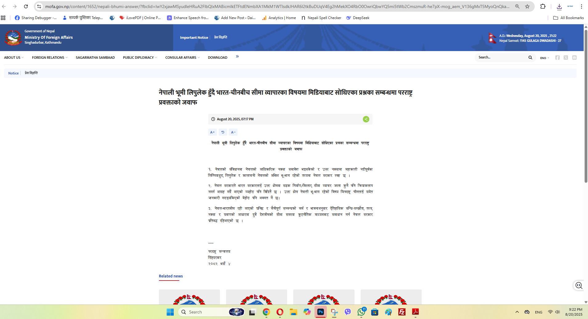 ४ भदौ, काठमाडौँ । भारत र चीनबीच नेपाली भूमि लिपुलेक पासबाट द्विपक्षीय व्यापार खोल्न भएको सहमतिप्रति नेपाल सरकारले कोही बोल्ने विषयमा अनिच्छा देखाएको छ । मिडियाबाट सोधेको प्रश्नको सन्दर्भ भन्दै पराराष्ट्र मन्त्रालयले विगतमात्र सम्झिएको छ ।