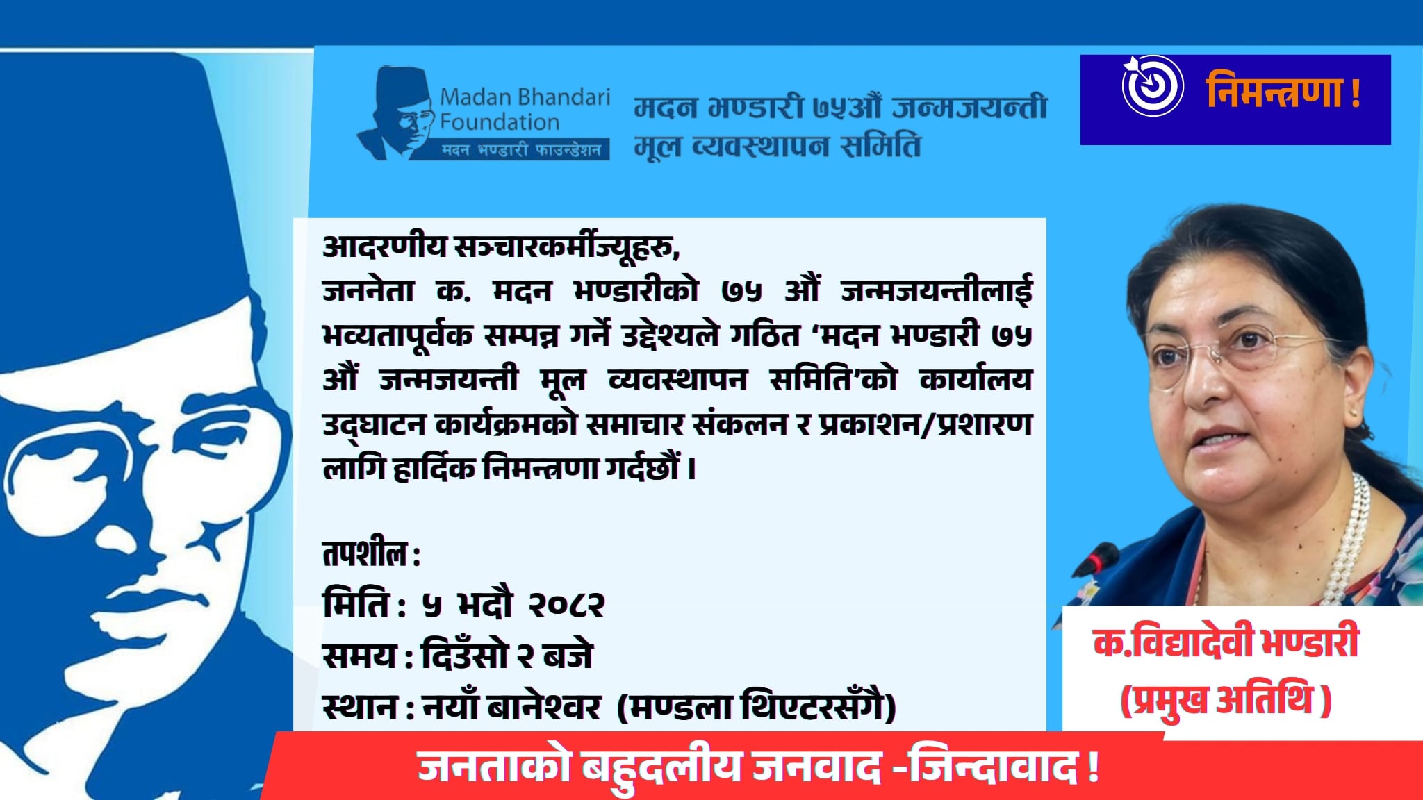 ४ भदौ, काठमाडौँ । मदन भण्डरीको ७५ औं हिरक जयन्ती मनाउनका लागि सम्पर्क कार्यालय खुलेको छ । भोलि बिहीबार कार्यालयको औपचारिक उद्घाटनको तयारी गरिएको छ । बिहीबार दिउँसो २ बजे एमाले पूर्व उपाध्यक्ष एवं पूर्व राष्ट्रपति विद्यादेवी भण्डारी र नेकपा एमाले वरिष्ठ उपाध्यक्ष ईश्वर पोखरेलले कार्यालय उद्घाटन पश्चात विशेष सम्बोधन गर्ने कार्यक्रम रहेको छ ।