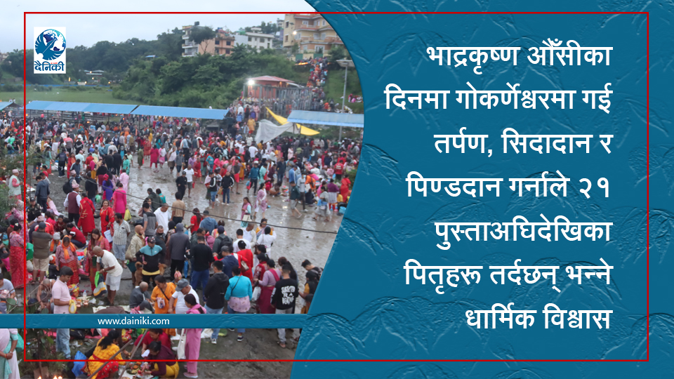 ७ भदौ, काठमाडौँ । दिवङ्गत पितालाई तर्पण, सिदादान र पिण्ड अर्पण गर्न आज बिहानैदेखि काठमाडौँको उत्तर पूर्वी भेगस्थित गोकर्णेश्वर उत्तरगया पितृ तीर्थ धाममा हजाराैँ भक्तजन उपस्थित भएका छन ।