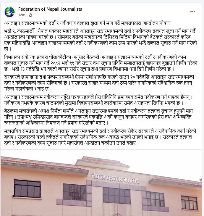 ९ भदाै, काठमाडौँ । नेपाल पत्रकार महासंघले अनलाइन सञ्चारमाध्यमको दर्ता र नवीकरण तत्काल खुला गर्न माग गर्दै आन्दोलनको घोषणा गरेको छ । सोमबार बसेको महासंघको डिजिटल मिडिया विभागको बैठकले सरकारले करिब एक महिनादेखि अनलाइन सञ्चारमाध्यमको दर्ता र नवीकरणको काम ठप्प पारेको भन्दै तत्काल सुचारु गर्न माग गरेको हो ।