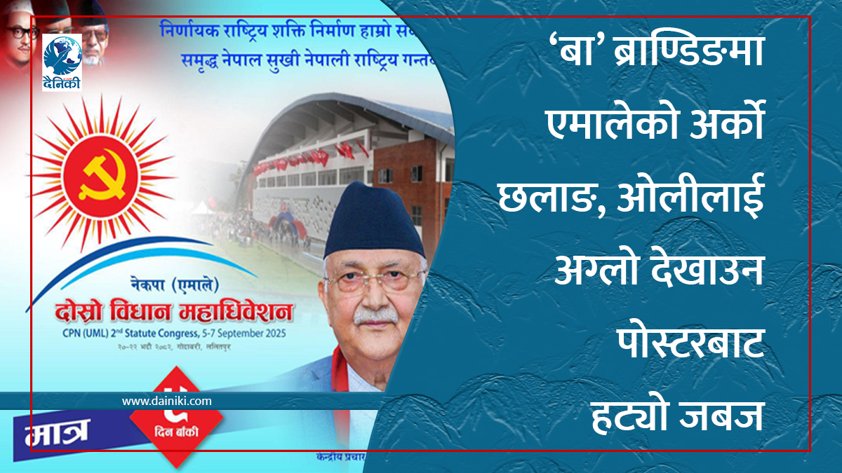 पार्टी अध्यक्ष ओलीलाई अग्लो बनाउने नाममा एमालेले विगतको अभ्यास र परम्परामा क्रमभंगता गर्दै अघि बढीरहेको छ । पुष्पलाल, मदन र मनमोहनको तस्बिर गायब बनाएर ‘बा’ ब्राण्डिङलाई थप समृद्ध बनाउन लागेको भनेर बिरोध भएपछि एमालेले जबज गायव पारेर नयाँ ट्रायल गर्न खोजेको छ । विधान महाधिवेशनका लागि प्रचार विभागको नाममा प्रकाशित पोस्टरमा ओलीको ठूलो तस्बिर राखेर ‘बा’ ब्राण्डिङ मजबुद बनेको सन्देश एमालेले प्रवाह गरिएको छ ।