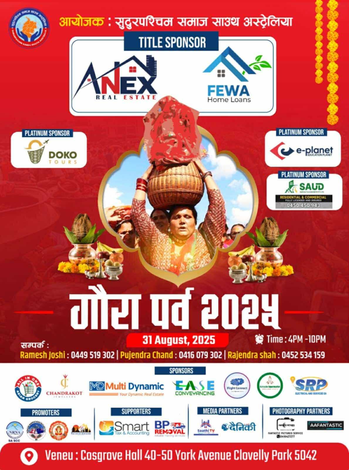 एडिलेड | सुदुर पश्चिम प्रदेशको महत्वपुर्ण पर्व गौरा पर्व पहिलो पटक एडिलेडमा अगष्ट ३१ आइतवार मनाइने भएको छ। कोल्भेली पार्क स्थित कोसग्रोभ हलमा दिनको ४ बजेबाट कार्यक्रम शुरु हुने भएको छ ।
