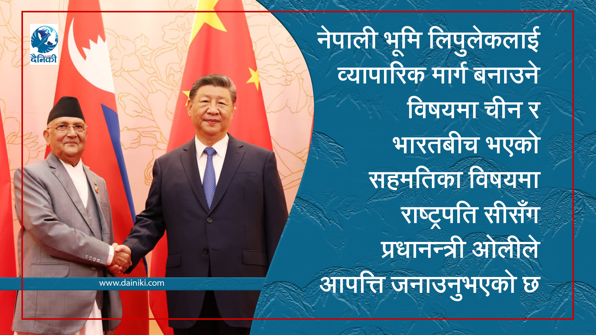 प्रधानमन्त्री केपी शर्मा ओली र चीनका राष्ट्रपति सी चिनफिङबीच चीनको थियानजिन अतिथि गृहमा दुई पक्षीय भेटवार्तामा यस्तो समझदारी भएको हो । सो अवसरमा प्रधानमन्त्री ओलीले नेपाली भूमि लिपुलेकलाई व्यापारिक मार्ग बनाउने विषयमा चीन र भारतबीच भएको सहमतिका विषयमा राष्ट्रपति सीसँग आपत्ति जनाउनुभएको छ ।