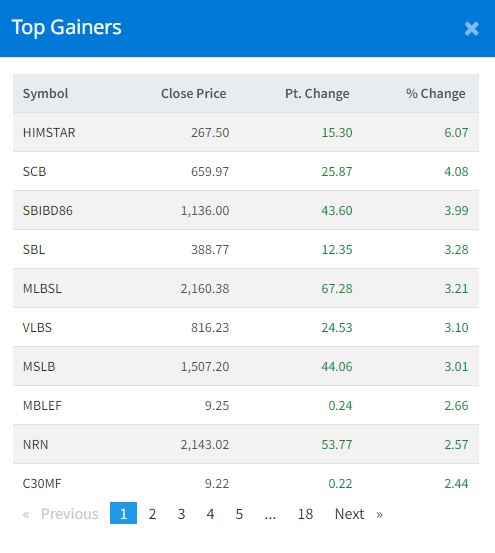 सोमबार हिमस्टार उर्जाको सेयरमूल्य सर्वाधिक बढेको छ । कम्पनीको सेयरमूल्य यस दिन ६.०७ प्रतिशतले बढेको छ । त्यसैगरी, यस दिन स्टान्डर्ड चार्टड बैंकको सेयरमूल्य ४.०८ प्रतिशतले बढेको छ ।