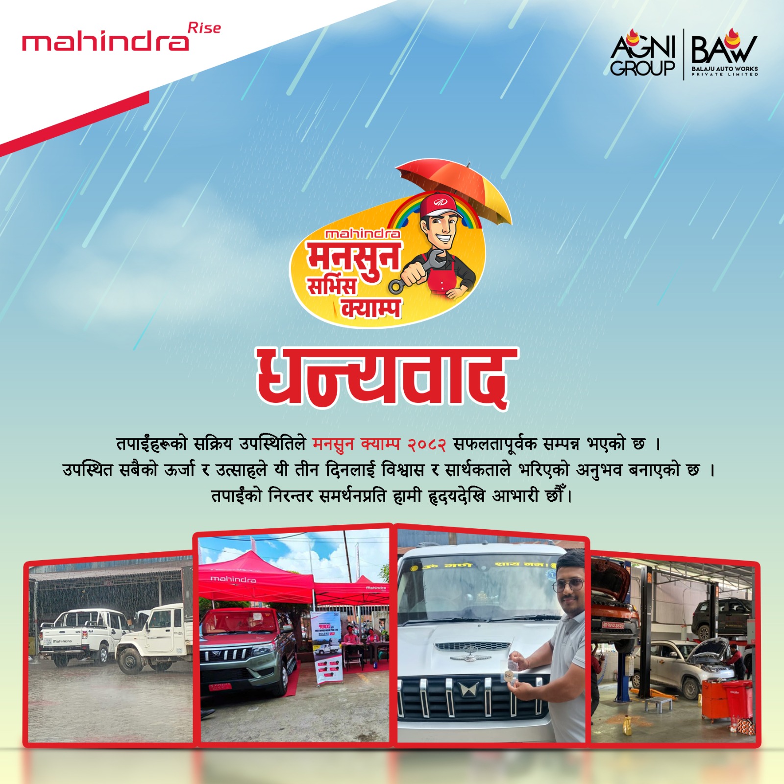 वर्षा मौसम लक्षित गरी आयोजना गरिएको यस कार्यक्रममा ग्राहकवर्गको उत्साहजनक सहभागिता र सकारात्मक प्रतिक्रिया रहेको थियो । बालाजु अटो वर्क्स, यी क्याम्पहरूमार्फत नेपाली ग्राहकसँगको सम्बन्धलाई अझ बढी बलियो र फलदायी बनाउन महत्वपूर्ण भूमिका खेल्ने विश्वास गर्दछ । बालाजु अटो वर्क्स, नेपाली ग्राहकहरूलाई वर्षौँदेखि नेपाली ग्राहकहरूलाई महिन्द्राको गाडीहरूको लागि गुणस्तरीय सेवा(सर्भिसिङ), जेन्युन स्पेयर पाटपूर्जा तथा ल्युब्रिकेन्ट्स प्रदान गर्दै आइरहेको छ ।