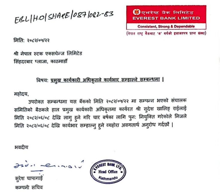 २२ भदौ, काठमाडौं । एभरेष्ट बैंकले प्रमुख कार्यकारी अधिकृत (सीईओ) मा सुदेश खालिङ राई पुनः दोहोरिनुभएको छ। बैंकको भदौ २२ गते बसेको संचालक समितिको बैठकले उहाँलाई पुनः सीईओमा नियुक्त गर्ने निर्णय गरेको हो।