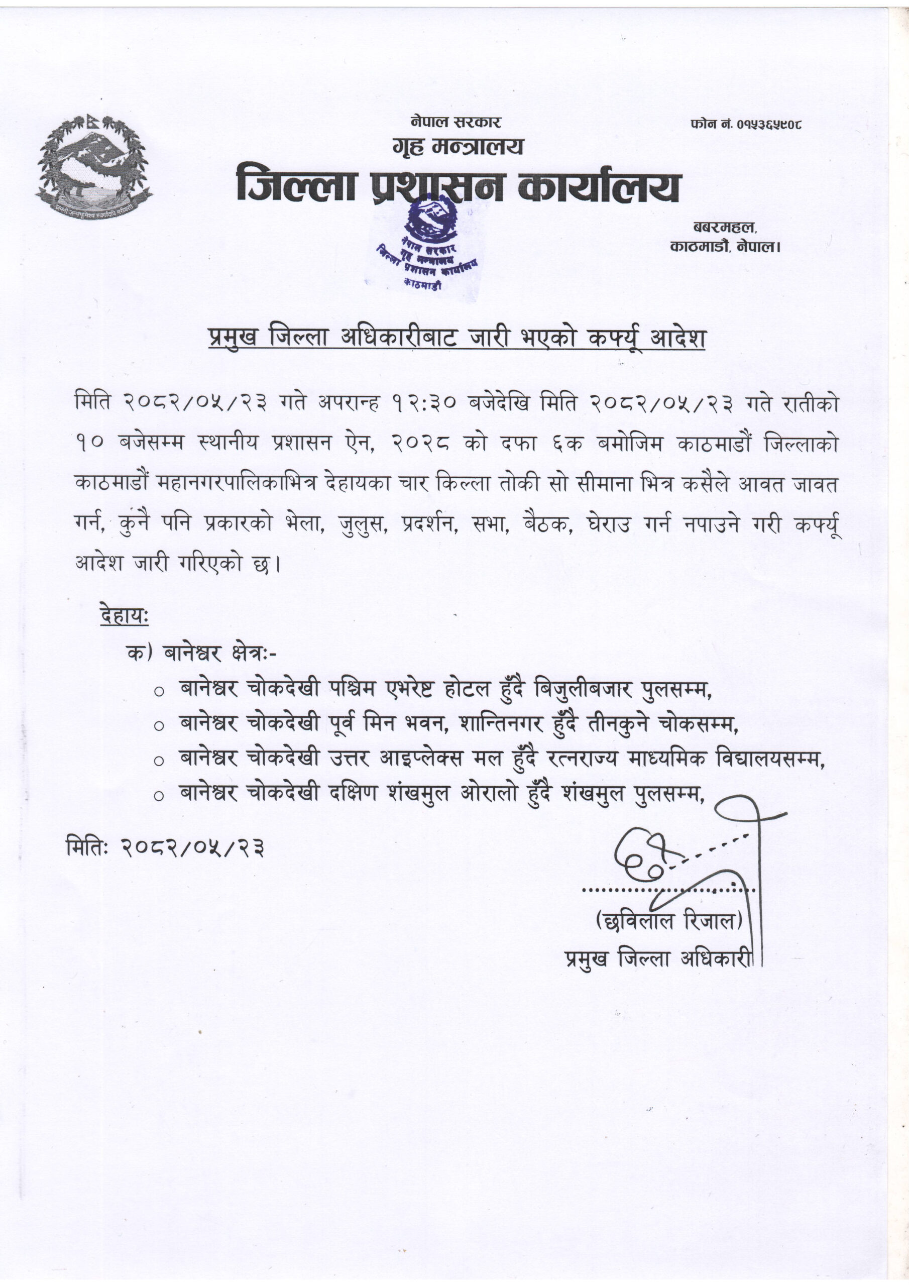 प्रमुख जिल्ला अधिकारी छविलाल रिजालद्वारा जारी आदेशअनुसार साउन २३ गते अपराह्न १२:३० बजेदेखि राति १० बजेसम्म कर्फ्यू लागु हुने भएको छ ।
