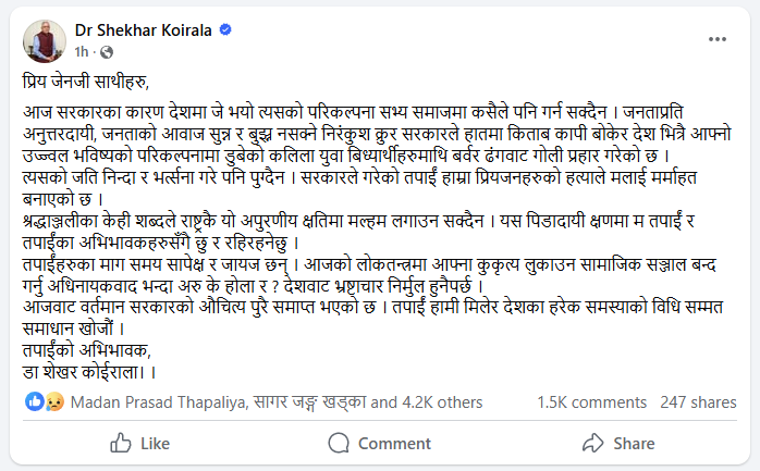 आज सरकारका कारण देशमा जे भयो त्यसको परिकल्पना सभ्य समाजमा कसैले पनि गर्न सक्दैन । जनताप्रति अनुत्तरदायी, जनताको आवाज सुन्न र बुझ्न नसक्ने निरंकुश क्रुर सरकारले हातमा किताब कापी बोकेर देश भित्रै आफ्नो उज्ज्वल भविष्यको परिकल्पनामा डुबेको कलिला युवा बिध्यार्थीहरुमाथि बर्वर ढंगवाट गोली प्रहार गरेको छ ।