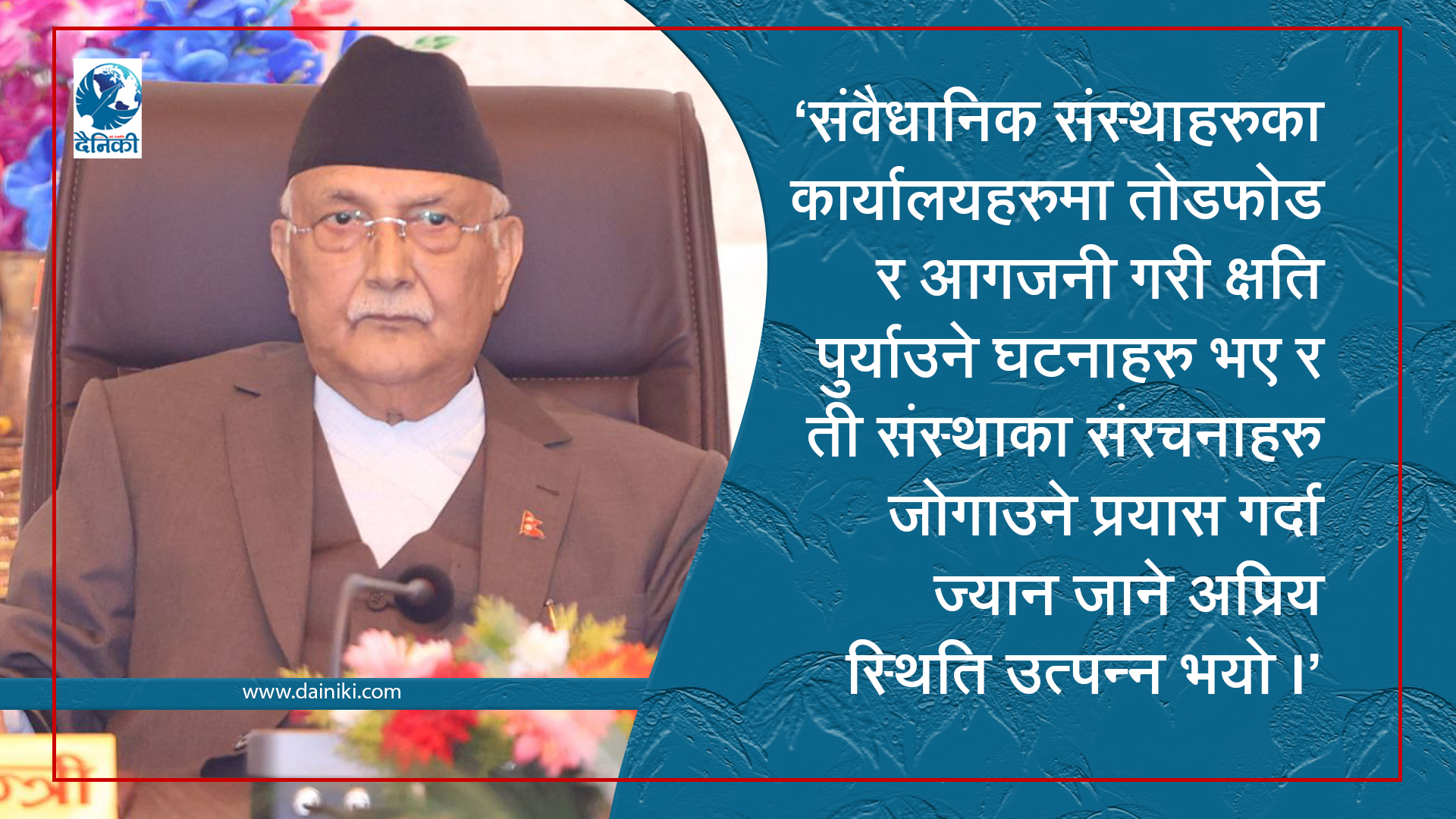 आजको प्रदर्शनको क्रममा नागरिकहरुले ज्यान गुमाउनु परेकोमा म अत्यन्तै दुःखी भएको छु । यस अकल्पनीय घटनाबाट परिवारका सदस्य गुमाउनु भएका परिवार र आफन्तजनप्रति गहिरो समवेदना व्यक्त गर्दछु । मृतकको परिवारलाई सरकारले उचित राहतको व्यवस्था गर्ने छ र घाइतेहरुको निःशुल्क उपचारको व्यवस्था गर्ने छ । आजको सम्पूर्ण घटनाक्रम र क्षति एवं त्यसको अवस्था र कारण समेतको छानविन र विश्लेषण गरी आगामी दिनमा यस्ता दुर्घटनाहरु हुन नदिन चालिने कदमहरुको सिफारिस समेत गर्नका लागि १५ दिनभित्र प्रतिवेदन पेश गर्नेरी छानविन समिति गठन गरिने कुराको विश्वास दिलाउन चाहन्छु ।