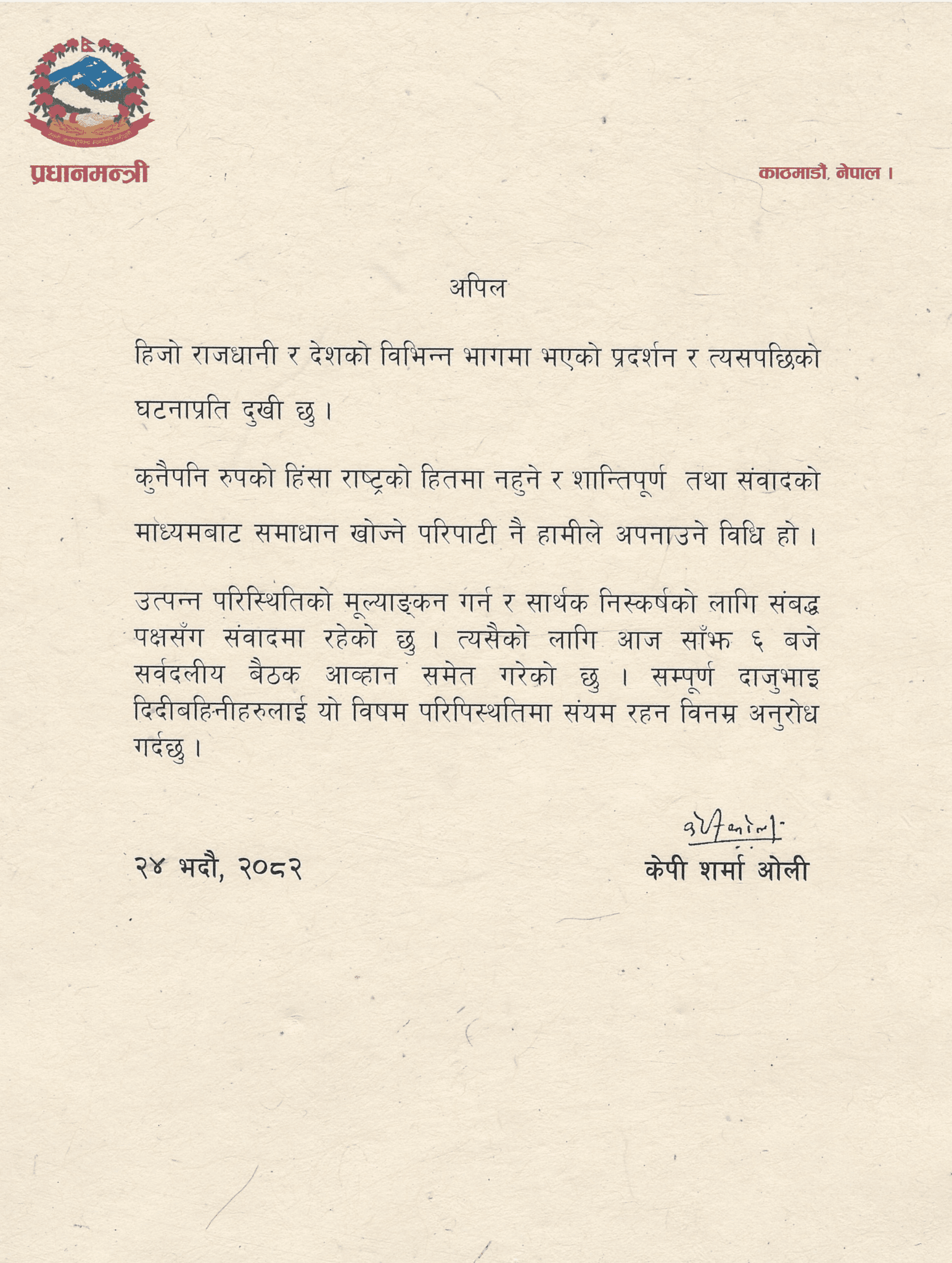 ‘कुनैपनि रूपको हिंसा राष्ट्रको हितमा नहुने र शान्तिपूर्ण तथा संवादको माध्यमबाट समाधान खोज्ने परिपाटी नै हामीले अपनाउने विधि हो’, ओलीले मंगलबार जारी गरेको अपिलमा भनिएको छ, ‘उत्पन्न परिस्थितिको मूल्याङ्कन गर्न र सार्थक निष्कर्षका लागि सम्बद्ध पक्षसँग संवादमा रहेको छ । त्यसैको लागि आज साँझ ६ बजे सर्वदलीय बैठक आह्वान समेत गरेको छु ।’