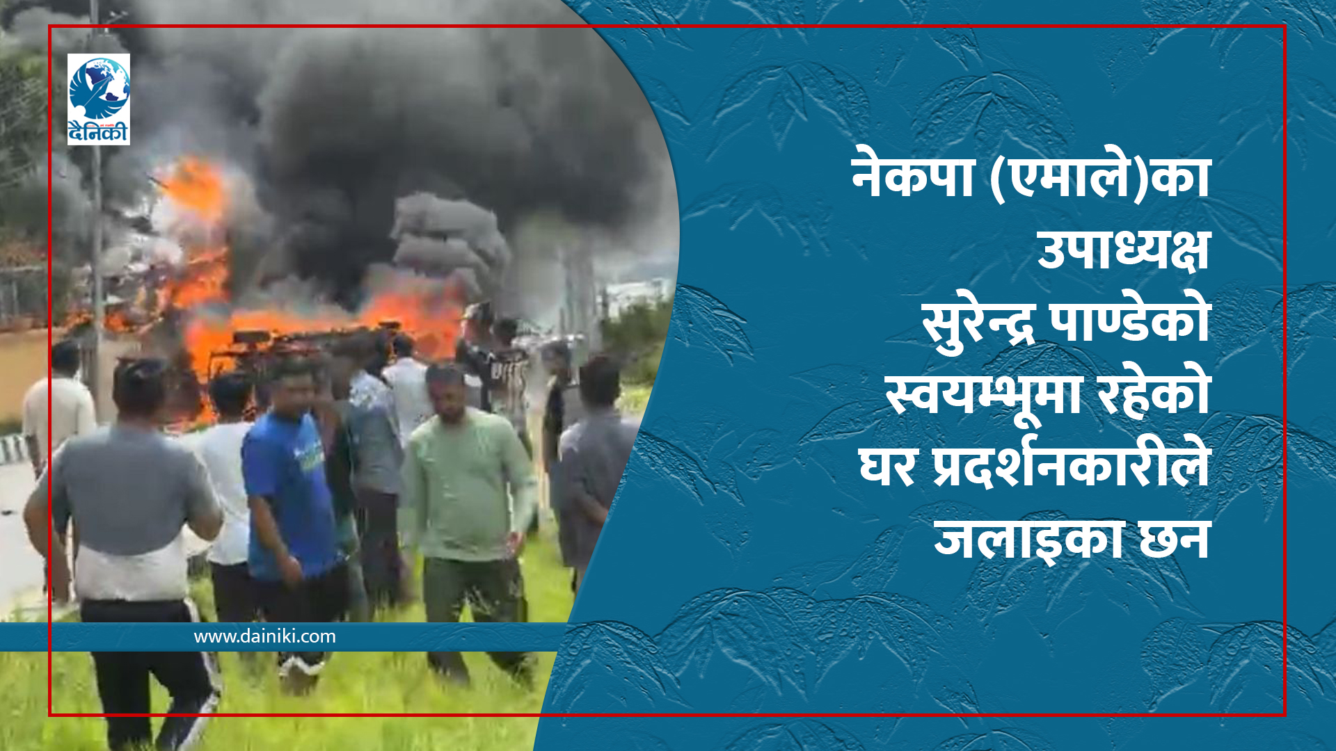 २४ भदौ, काठमाडौँ । सरकारले शान्तिपूर्ण प्रदर्शनमा बल प्रयोग गरेर २० जना युवाको ज्यान लिएपछि आक्रोशित बनेका प्रदर्शनकारीले एमाले उपाध्यक्ष सुरेन्द्र पाण्डेको घरमा आगजनी गरेका छन ।