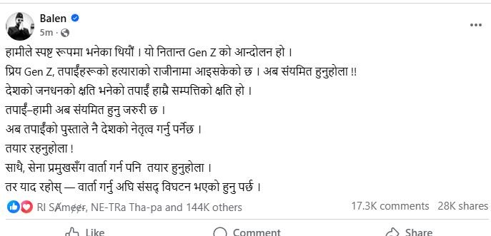 बालेनले फेसबुकमा लेख्दै भन्नुभएकाे छ, ‘हामीले स्पष्ट रूपमा भनेका थियौं । यो नितान्त Gen Z को आन्दोलन हो । प्रिय Gen Z, तपाईंहरूको हत्याराको राजीनामा आइसकेको छ । अब संयमित हुनुहोला !! देशको जनधनको क्षति भनेको तपाईं हाम्रै सम्पत्तिको क्षति हो । तपाईं–हामी अब संयमित हुनु जरुरी छ । अब तपाईंको पुस्ताले नै देशको नेतृत्व गर्नु पर्नेछ । तयार रहनुहोला ! साथै, सेना प्रमुखसँग वार्ता गर्न पनि तयार हुनुहोला । तर याद रहोस् — वार्ता गर्नु अघि संसद् विघटन भएको हुनु पर्छ ।