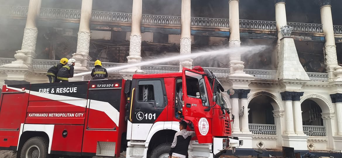 २५ भदौ, काठमाडौँ । जेनजी पुस्ताका युवाको भ्रष्टाचारविरूद्धको आन्दोलनका नाममा आगजनी गरिएको सिंहदरबारमा आगलागीको १६ घण्टापछि काठमाडौँ महानगरपालिकाको दमकल पुगेको छ ।