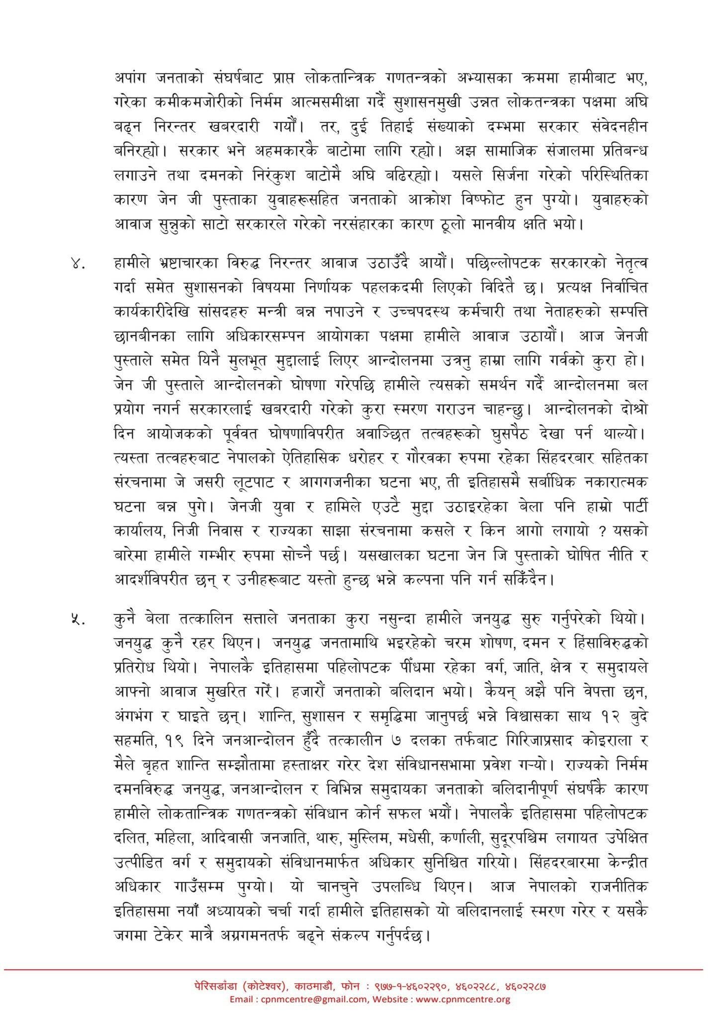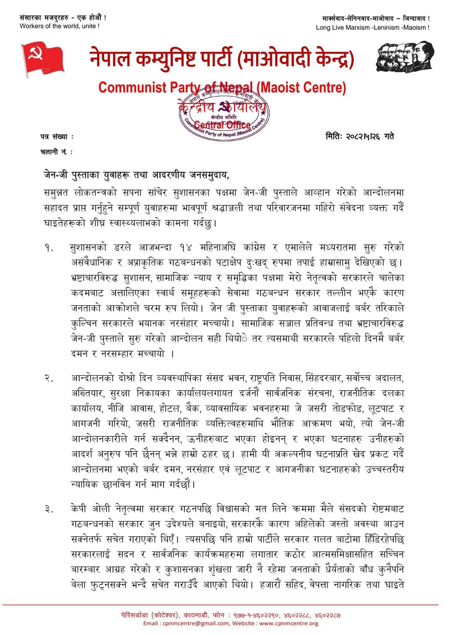 २६ भदौ, काठमाडौं । नेकपा माओवादी केन्द्रका अध्यक्ष पुष्पकमल दाहाल प्रचण्डले जेनजी युवाहरुले उठाएका माग संविधान र वर्तमान संसदीय प्रक्रियाभित्रबाटै खोजिनुपर्ने बताएका छन् । आज एक विज्ञप्ति जारी गर्दै उनले भनेका छन्, ‘हाम्रो स्पष्ट मत छ, लोकतन्त्रको विकल्प समुन्नत र अझ बढी सुदृढ लोकतन्त्र, गणतन्त्रको विकल्प अझ सुदृढ गणतन्त्र मात्रै हो । जेनजी पुस्ताको माग न लोकतान्त्रिक व्यवस्था र संविधानविरुद्ध थियो, न संसद् विघटनका पक्षमा नै । उहाँहरुले उठाएका माग संविधान र वर्तमान संसदीय प्रक्रियाभित्रबाट पूरा हुन सक्छन् भन्नेमा हामी विश्वस्त छौं ।’