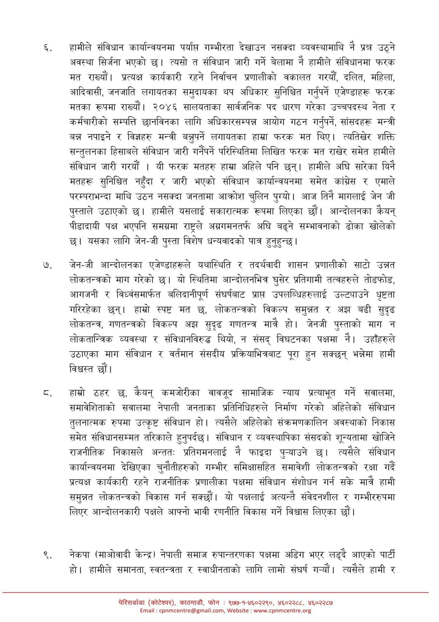 विज्ञप्तिमा थप लेखिएको छ, ‘हाम्रो ठहर छ, कैयन् कमजोरीका बाबजुद सामाजिक न्याय प्रत्याभूत गर्ने सवालमा, समावेशिताको सवालमा नेपाली जनताका प्रतिनिधिहरुले निर्माण गरेको अहिलेको संविधान तुलनात्मक रुपमा उत्कृष्ट संविधान हो । त्यसैले अहिलेको संक्रमणकालीन अवस्थाको निकास समेत संविधानसम्मत तरिकाले हुनुपर्दछ । संविधान र व्यवस्थापिका संसदको शून्यतामा खोजिने राजनीतिक निकासले अन्तत: प्रतिगमनलाई नै फाइदा पुर्याउने छ ।’