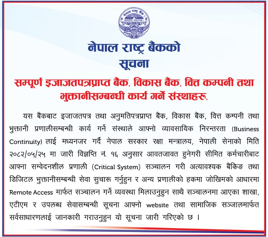 सूचनामा भनिएको छ, “बैङ्क तथा वित्तीय संस्थाले आफ्ना संवेदनशील प्रणाली सीमित कर्मचारीमार्फत सञ्चालन गरी अत्यावश्यक बैङ्किङ तथा डिजिटल भुक्तानीसम्बन्धी सेवा सञ्चालन गर्नुपर्नेछ । अन्य प्रणालीमा भने जोखिमको आधारमा रिमोट एसिसमार्फत सञ्चालन गर्ने व्यवस्था मिलाउनुपर्नेछ,” नेपाल राष्ट्र बैङ्कले जनाएको छ ।