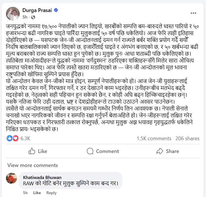 त्यतिबेला माओवादीहरूले युद्धको नाममा ‘वर्गदुश्मन’ ठहरिएका शक्तिहरूसँगै मिलेर सारा औचित्य समाप्त पारेका थिए। आज फेरि त्यस्तै खतरा मडारिएको छ — जेन-जी आन्दोलनको मूल भावना राष्ट्रपतिको खोपिमा सुम्पिने प्रयास हुँदैछ।