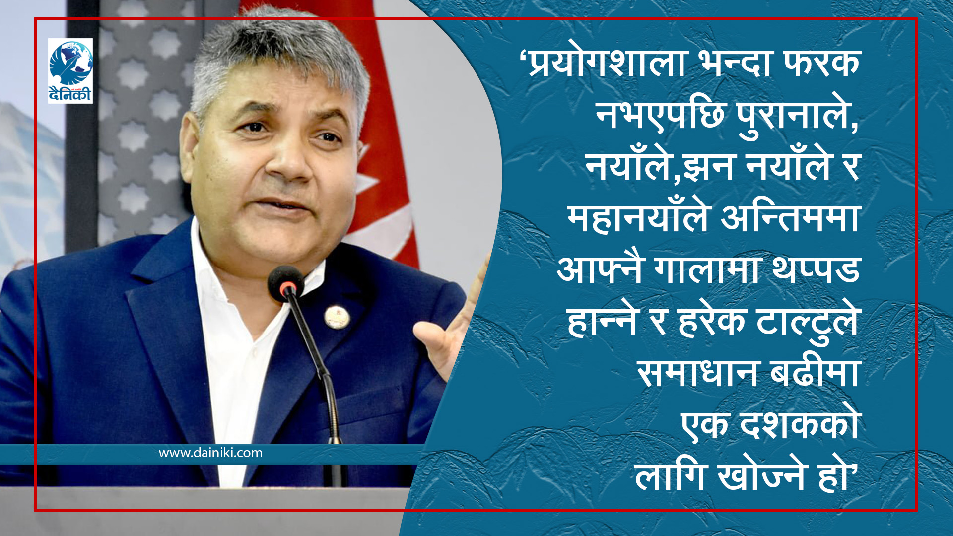 सामाजिक सञ्जल मार्फत चोटिलो व्यंग्य गर्ने बास्कोटाले शुक्रबार बिहानै भन्नुभएको छ, ‘प्रयोगशाला भन्दा फरक नभएपछि पुरानाले, नयाँले, झन नयाँले र महानयाँले अन्तिममा आफ्नै गालामा थप्पड हान्ने र हरेक टाल्टुले समाधान बढीमा एक दशकको लागि खोज्ने हो।किनकि यहाँ सर्पको मुखमा परेको भ्यागुत्तोले फट्याङ्ग्राको शिकार गर्न मुख बाउँछ, जसको आन्दोलन उही नेता हुनु नि। फेरि उत्खनन किन ?’