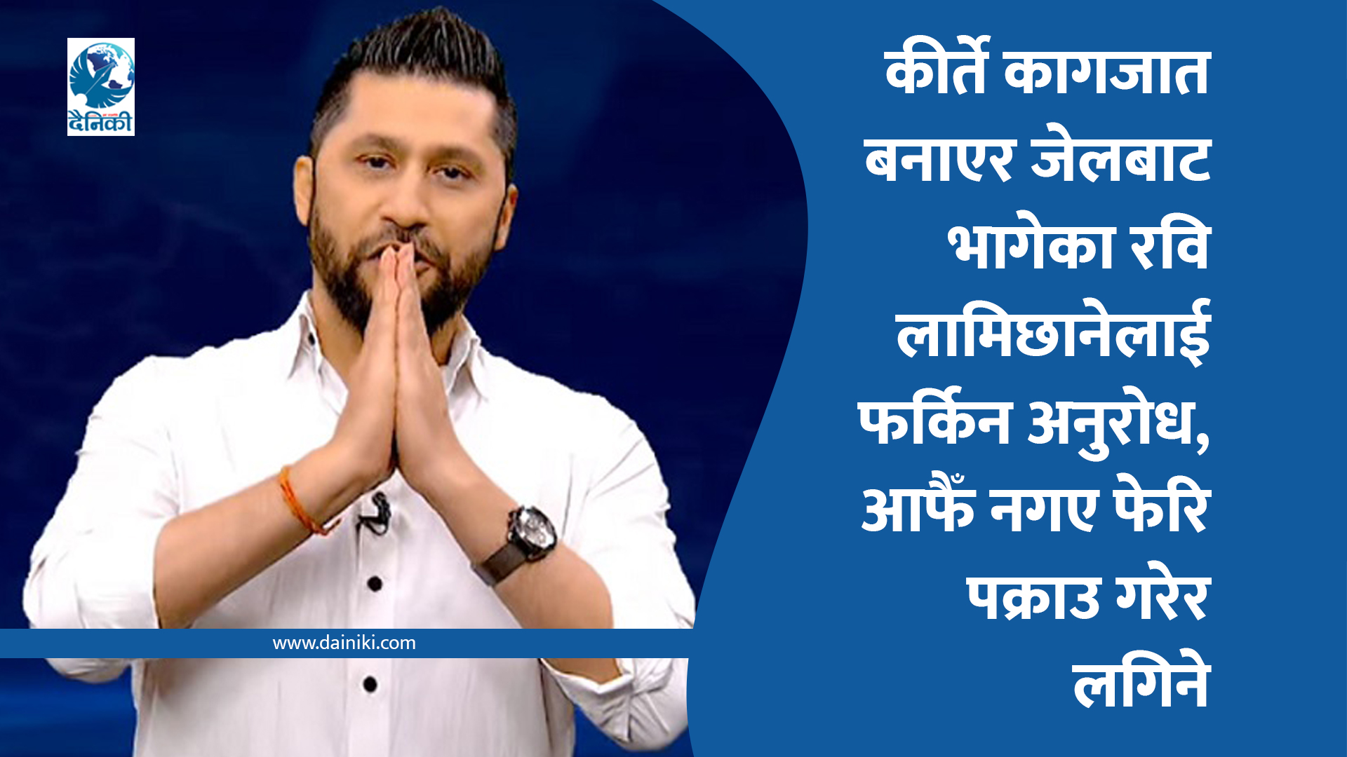 २७ भदौ, काठमाडौँ । सहकारी ठगीका मास्टरमाइन्ड रवि लामिछानेलाई कारागार फर्किन अनुरोध गरिएको छ । नख्खु कारागार प्रशासनले कीर्ते कागजात बनाएर जेलबाट भागेका रविसहित अन्य कैदीलाई फर्केर आउन अनुरोध गरेको छ ।