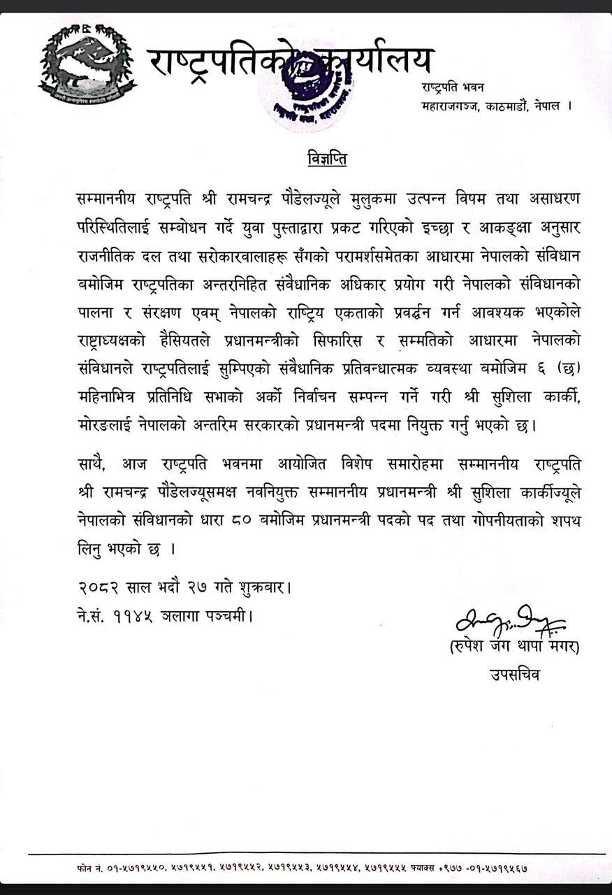 पहिलो महिला प्रधानमन्त्री बनिन् सुशीला कार्की, ६ महिनाभित्र चुनाव गराउनुपर्ने