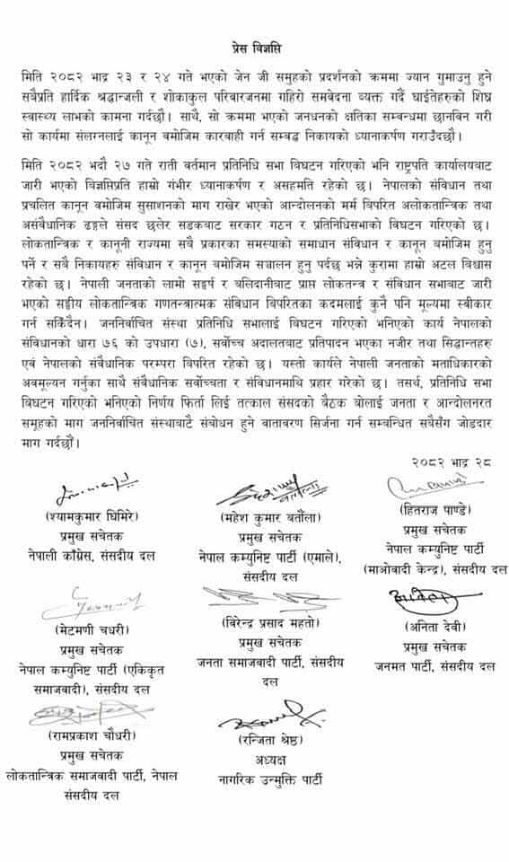 नेपाली कांग्रेस, नेकपा एमाले, नेकपा माओवादी केन्द्र, नेकपा एकीकृत समाजवादी, जसपा, जनमत पार्टी, लोकतान्त्रिक समाजवादी पार्टी र नागरिक उन्मुक्ति पार्टीले संयुक्त विज्ञप्ति जारी गर्दै प्रतिनिधिसभा विघटनलाई संविधानमाथिको प्रहार भनेका छन् ।