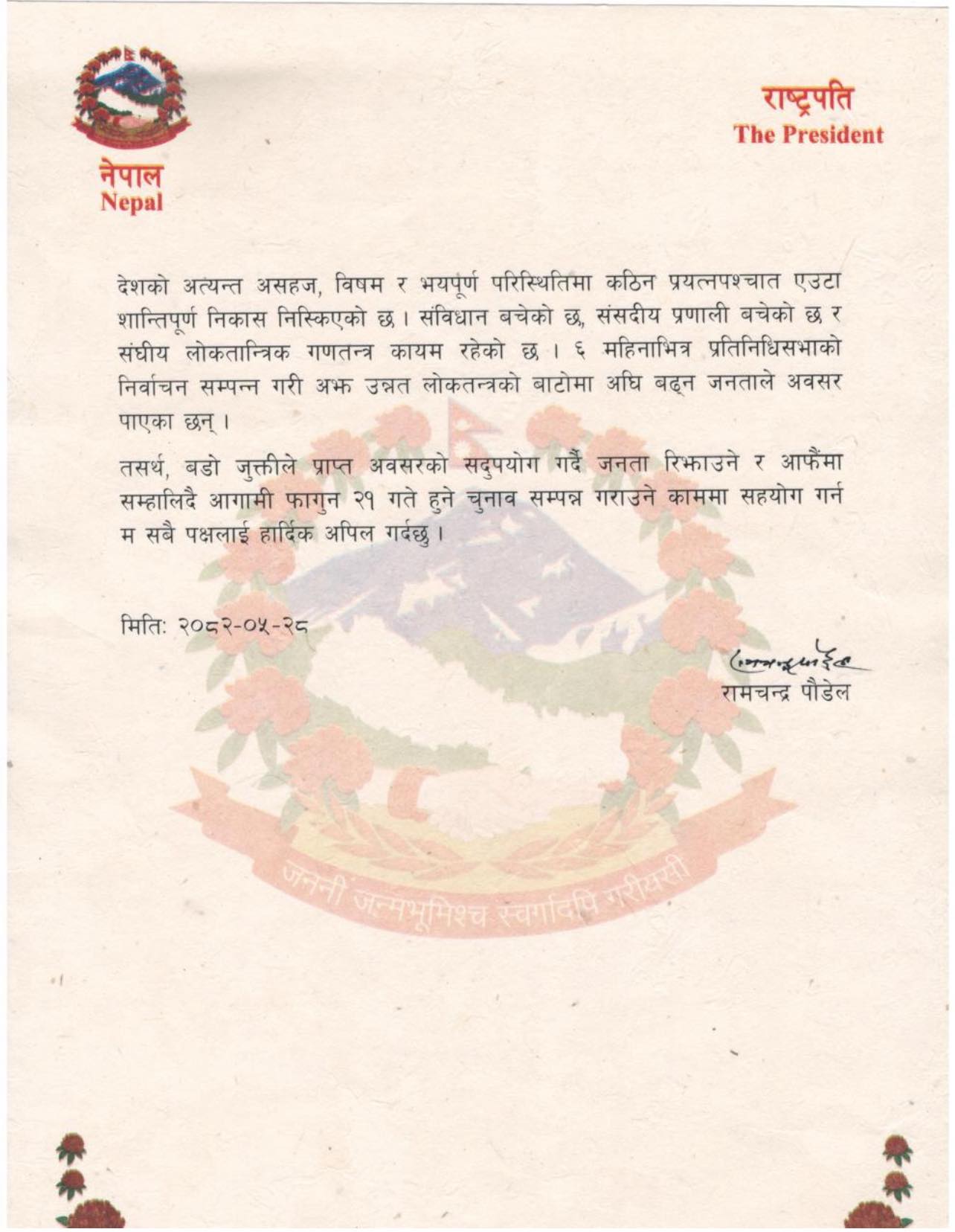 राष्ट्रपति पौडेलले शनिबार वक्तव्य जारी गरी बडो जुक्तीले प्राप्त अवसरको सदुपयोग गर्दै जनता रिझाउने र आफैंमा सम्हालिँदै आगामी फागुनका लागि तोकिएको चुनाव सम्पन्न गराउन सबै पक्षलाई अपिल गरेका हुन् ।