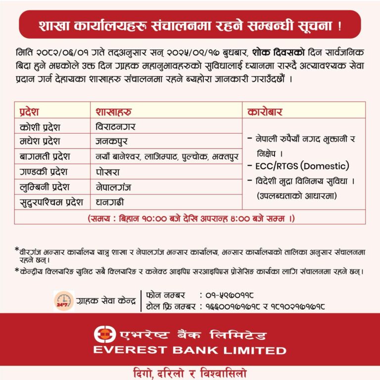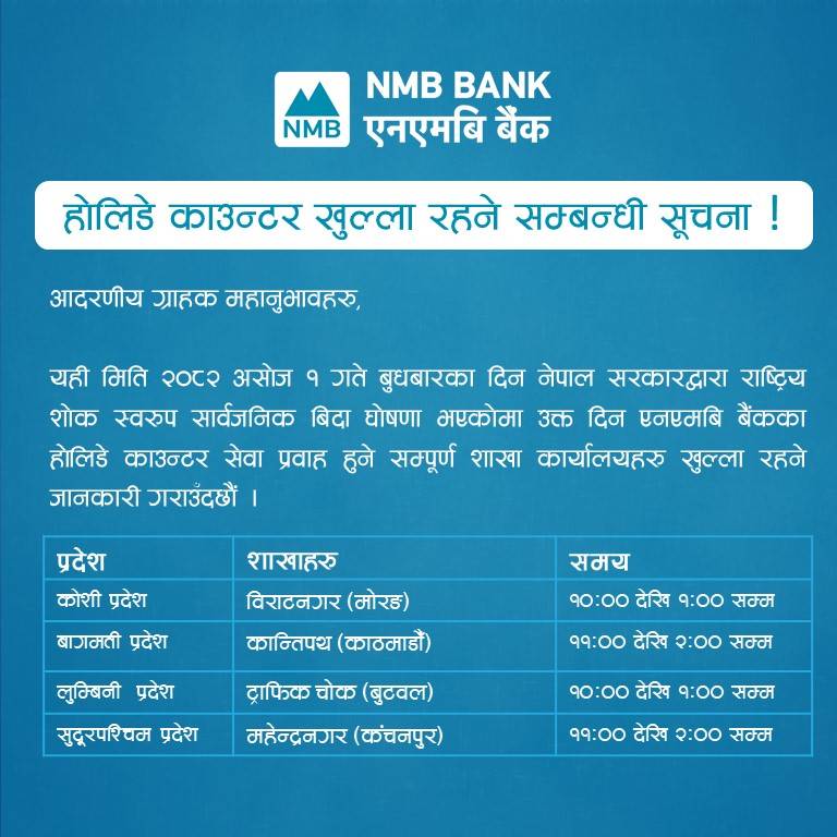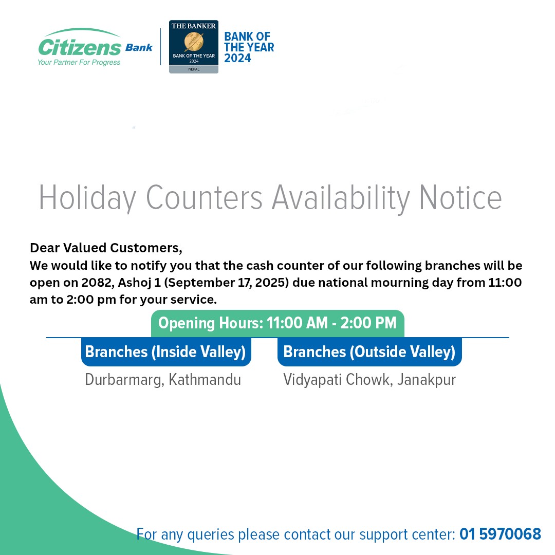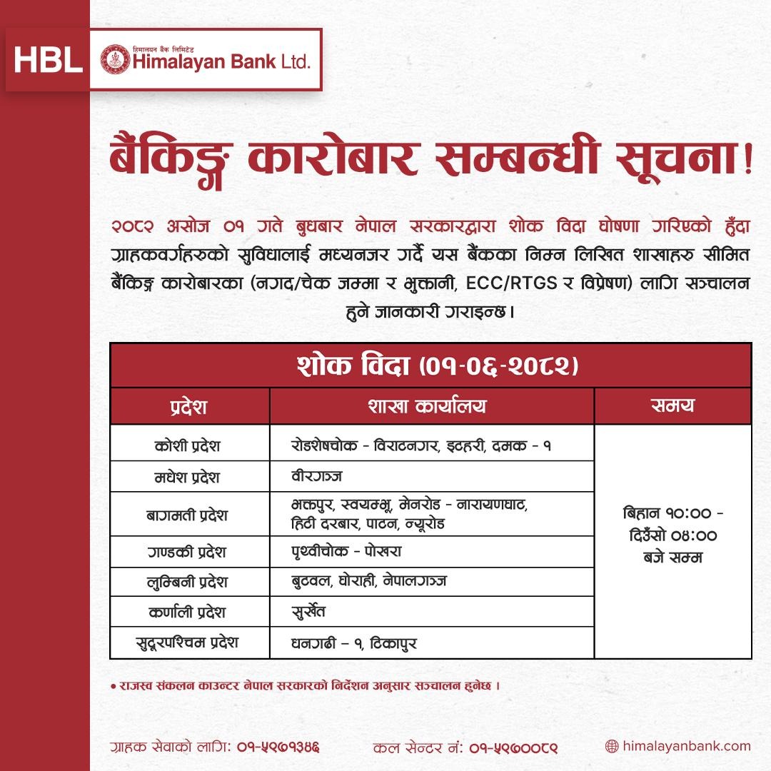 १ असोज, काठमाडौं । सरकारले जेन जी आन्दोलनका क्रममा शाहादत प्राप्त गरेकाहरुको सम्मानमा आज सार्वजनिक बिदा दिएको छ । सार्वजनिक बिदामा सेयर बजार, बैंक तथा वित्तीय संस्था,सरकारी कार्यालय, शिक्षण संस्था बन्द रहेका छन् । तर, सार्वजनिक बिदामा पनि अधिकांश वाणिज्य बैंकहरूले सेवा दिइरहेका छन् । बैंकहरूले ग्राहकका सुविधालाई मध्यनजर गर्दै केही शाखा खुला राख्ने निर्णय गरेको जनाएका छन् ।