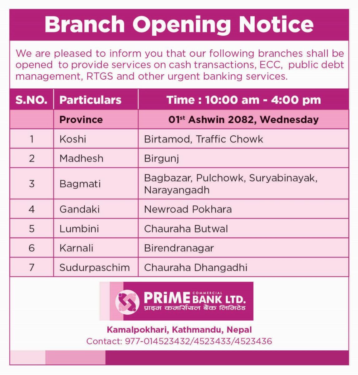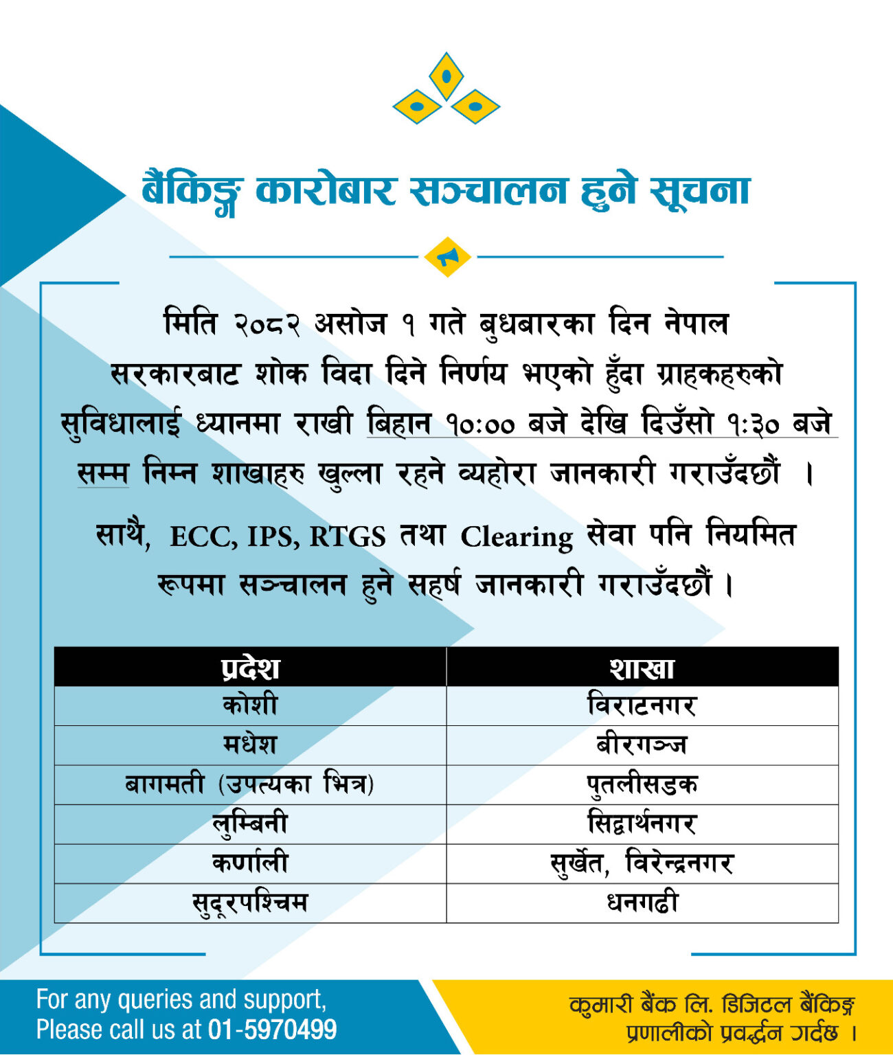 बैंकहरुले आफ्ना ग्राहकलाई नियमित सेवा प्रवाहमा अवरोध नहोस् भन्ने उद्देश्यले बिदाको दिनमा समेत शाखा सञ्चालन गरेको जनाएका छन् । केही बैंकहरुले आफ्ना शाखा तथा काउन्टर खुला रहने सूचना सामाजिक सञ्जाल र वेबसाइटमार्फत सार्वजनिक गरेका छन् ।
