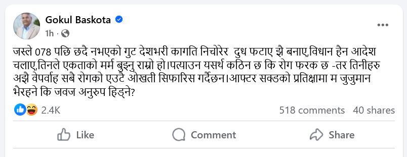 पार्टी महासचिव पोखरेल लगायतले पार्टी एकतावद्ध बन्नुपर्ने भन्दै सुगा रटाइ फेसबुकमा पोखरिरँदा बाँस्कोटाले भन्नुभएको छ, ‘जसले ०७८ पछि छदै नभएको गुट देशभरी कागति निचोरेर दुध फटाए झै बनाए, विधान हैन आदेश चलाए, तीनले एकताको मर्म बुझ्नु राम्रो हो । पत्याउन यसर्थ कठिन छ कि रोग फरक छ -तर तिनीहरु अझै वेपर्वाह सबै रोगको एउटै ओखती सिफारिस गर्दैछन। आफ्टर सक्डको प्रतिक्षामा म जुजुमान भैरहने कि जवज अनुरुप हिड्ने ?’