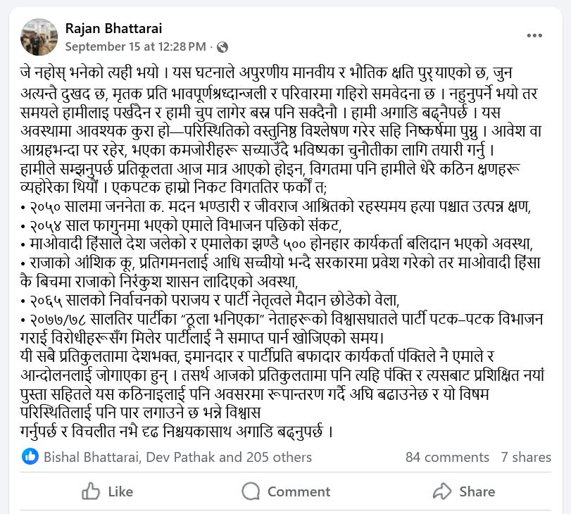 उहाँले सार्वजिनक गरेको मनन गर्नुपर्ने कुरा यत्तो छ, ‘नयाँ पुस्ताको आकांक्षा, माग र बलिदानको सम्मान गरौँ। त्यसको आवरणमा गर्न खोजिएका प्रतिगमनकारी हर्कत र विध्वंसको विरोध गरौँ। नयाँ पुस्ताको विश्वास जित्ने गरी पार्टी गतिविधि अघि बढाऔँ। जनतासँगको सम्बन्धलाई जिवन्त र घनिष्ठ बनाऔँ । जनपक्षीय जीवनशैली र आचरणमा जोड दिऔँ । आन्तरिक एकतामा जोड दिऔँ, पार्टी पंक्तिको मनोबल उच्च बनाऔँ। संविधान र संघीय लोकतान्त्रिक गणतन्त्रको रक्षाका लागि जागरूक बनौँ र बनाऔँ । लोकतान्त्रिक शक्तिहरूसँगको सम्बन्ध र सहकार्यमा जोड दिऔँ । जबजको जगमा उभिएको हाम्रो पार्टी र आन्दोलनले वर्तमानका सबै चुनौतीलाई सम्बोधन र समाधान गर्न सफल हुनेछ।’