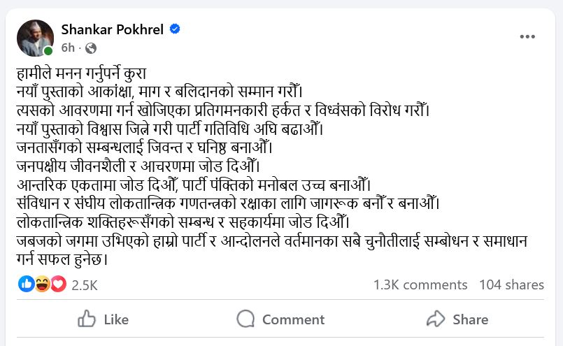 पार्टीको मुल नेतृत्वमात्र नभइ महासचिव भन्दा माथिका सबै नेता विदा गर्नुपर्ने र पार्टीको नेतृत्व पुस्तान्तरण गर्नुपर्ने आवाज चर्किरहेको समयमा महासचिव पोखरेलले भने फेरि ८ बुँदामा नारा सिफरिस गर्दै नेताहरूई यो गरौँ र त्यो गरौँ भन्ने विषय सार्वजिनक गर्नुभएको छ ।