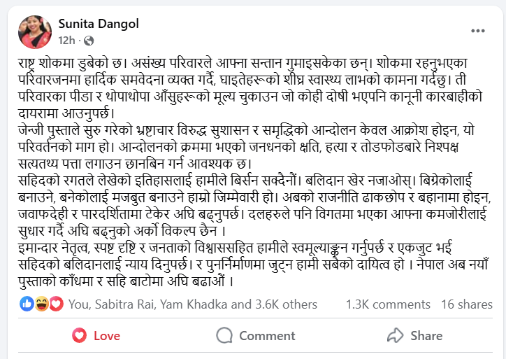काठमाडाैँ महानगरपालिकाका उपप्रमुख सुनिता डंगोलले पनि एमालेको नामै नलिइ अब नेतृत्व पुस्तान्तरण र हस्तान्तरण गर्नुपर्ने कुरा उल्लेख गर्नुभएको छ । एमाले नेतृ समेत रहनुभएको डंगोलले नेपाल अब नयाँ पुस्ताको काँधमा र सहि बाटोमा अघि बढाऔँ भन्ने अपिल नै गर्नुभएको छ । उहाँले भन्नुभएको छ, ‘इमान्दार नेतृत्व, स्पष्ट दृष्टि र जनताको विश्वाससहित हामीले स्वमूल्याङ्कन गर्नुपर्छ र एकजुट भई सहिदको बलिदानलाई न्याय दिनुपर्छ। र पुनर्निर्माणमा जुट्न हामी सबैको दायित्व हो । नेपाल अब नयाँ पुस्ताको काँधमा र सहि बाटोमा अघि बढाऔं ।’
