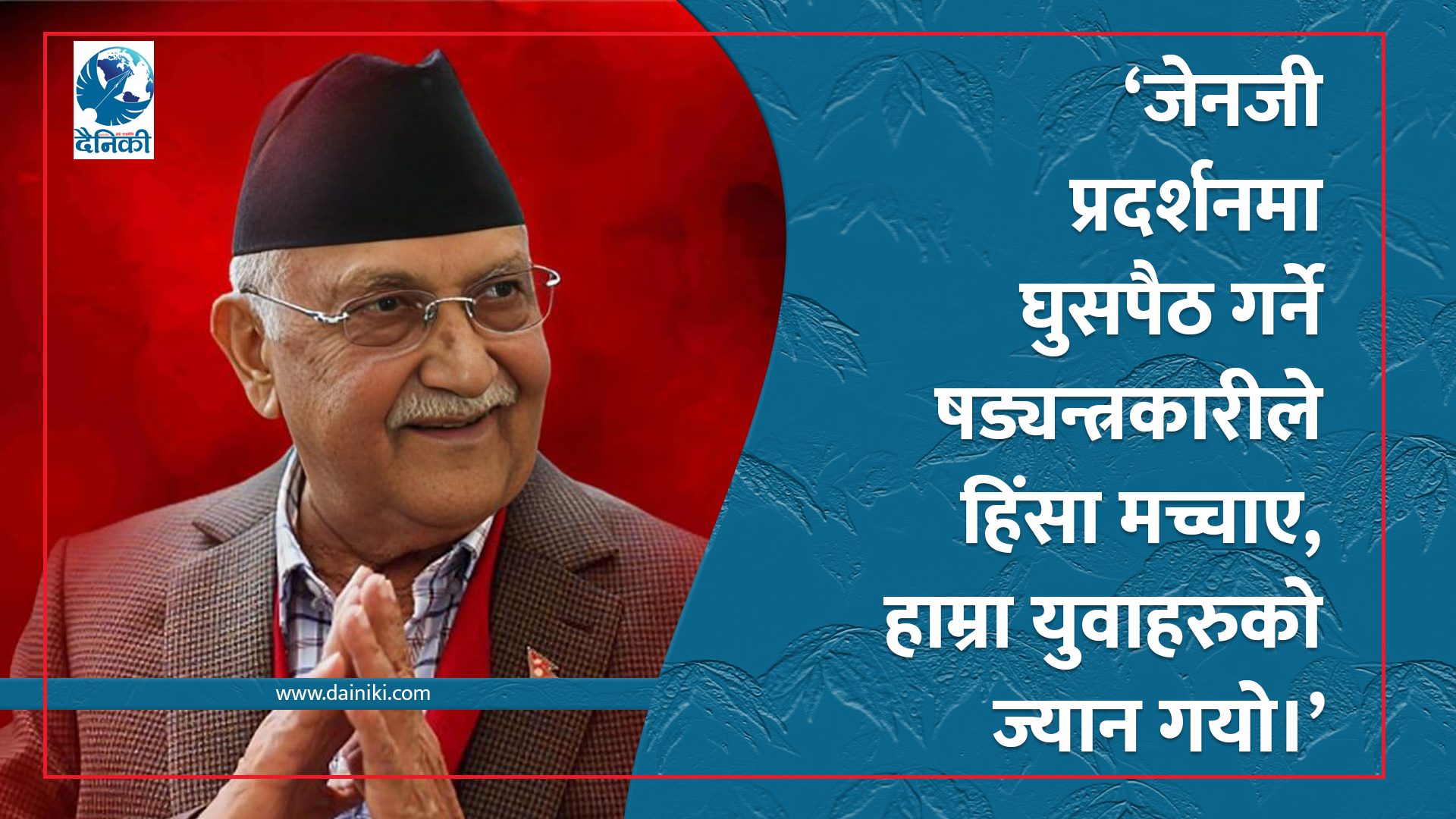 ३ असोज, काठमाडौँ । निवर्तमान प्रधानमन्त्री एवं नेकपा एमालेका अध्यक्ष केपी शर्मा ओलीले जेनजी प्रदर्शनमा घुसपैठ गर्ने षड्यन्त्रकारीहरूले हिंसा मच्चाएको आरोप लगाउनुभएको छ । त्यही प्रदर्शनको बलमा प्रधानमन्त्रीबाट राजीनामा दिएर बालुवाटारबाट भागेका ओलीले १० दिनपछि संविधान दिवसको अवसर पारेर यस्तो बताउनुभएको हो । यस्तो छ ओलीको भनाइ