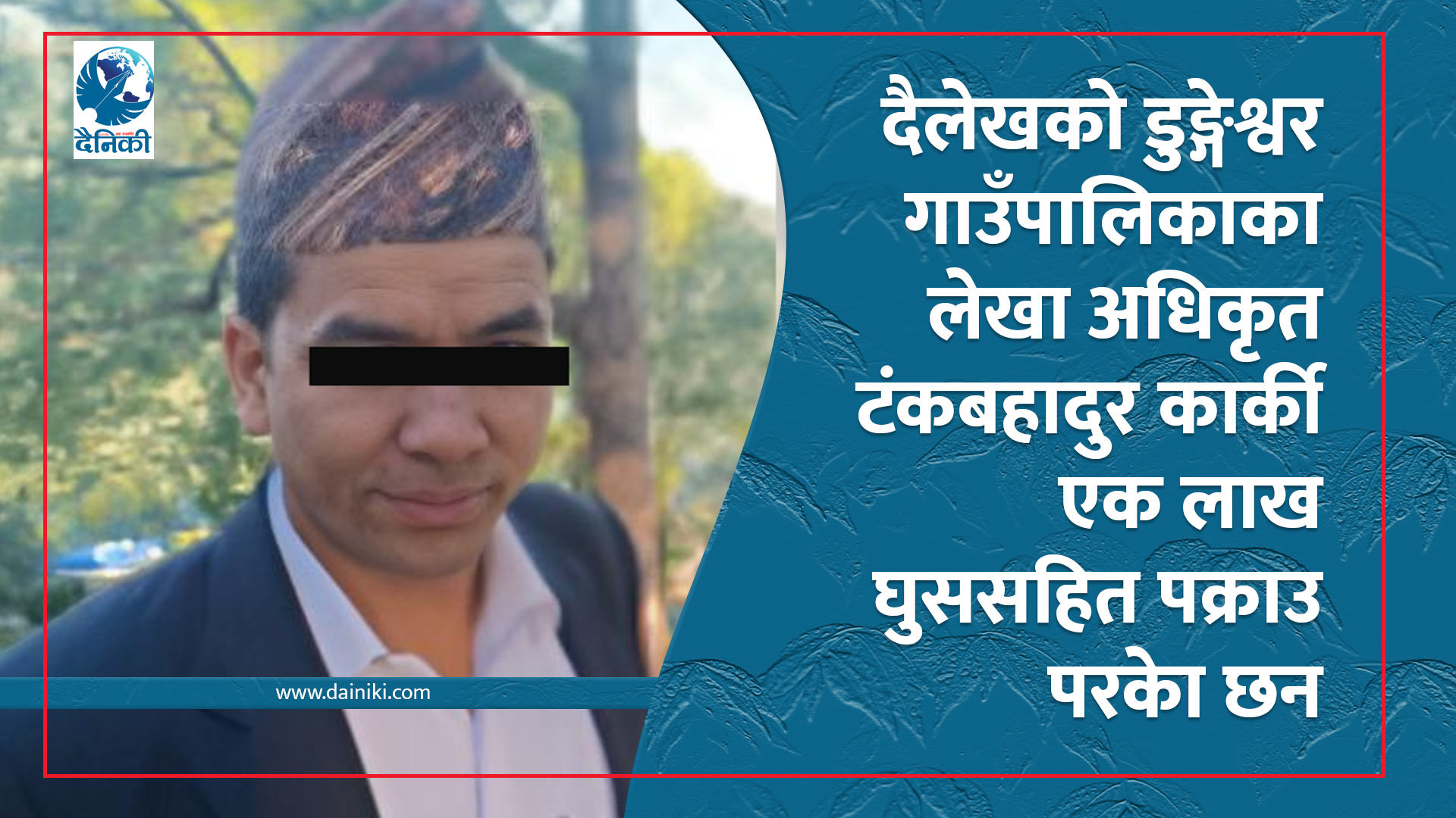 ३ असोज, काठमाडाैँ । दैलेखको डुङ्गेश्वर गाउँपालिकाका लेखा अधिकृत टंकबहादुर कार्की घुससहित पक्राउ परेका छन् । सडक निर्माणको भुक्तानीमा उपभोक्ता समितिका पदाधिकारीसँग एक लाख रूपैयाँ घुस खाँदाखाँदै कार्की पक्राउ परेका हुन ।