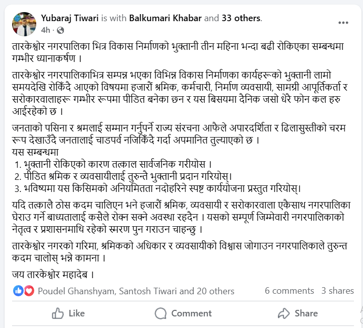 उहाँले सामाजिक सञ्जाल फेसबुक मार्फत भन्नुभएको छ, ‘तारकेश्वोर नगरपालिका भित्र विकास निर्माणको भुक्तानी तीन महिना भन्दा बढी रोकिएका सम्बन्धमा गम्भीर ध्यानाकर्षण । तारकेश्वोर नगरपालिकाभित्र सम्पन्न भएका विभिन्न विकास निर्माणका कार्यहरूको भुक्तानी लामो समयदेखि रोकिँदै आएको विषयमा हजारौं श्रमिक, कर्मचारी, निर्माण व्यवसायी, सामग्री आपूर्तिकर्ता र सरोकारवालाहरू गम्भीर रूपमा पीडित बनेका छ्न र यस बिसयमा दैनिक जसो धेरै फोन कल हरु आईरहेको छ । जनताको पसिना र श्रमलाई सम्मान गर्नुपर्ने राज्य संरचना आफैले अपारदर्शिता र ढिलासुस्तीको चरम रूप देखाउँदै जनतालाई चाडपर्व नजिकिँदै गर्दा अपमानित तुल्याएको छ ।’