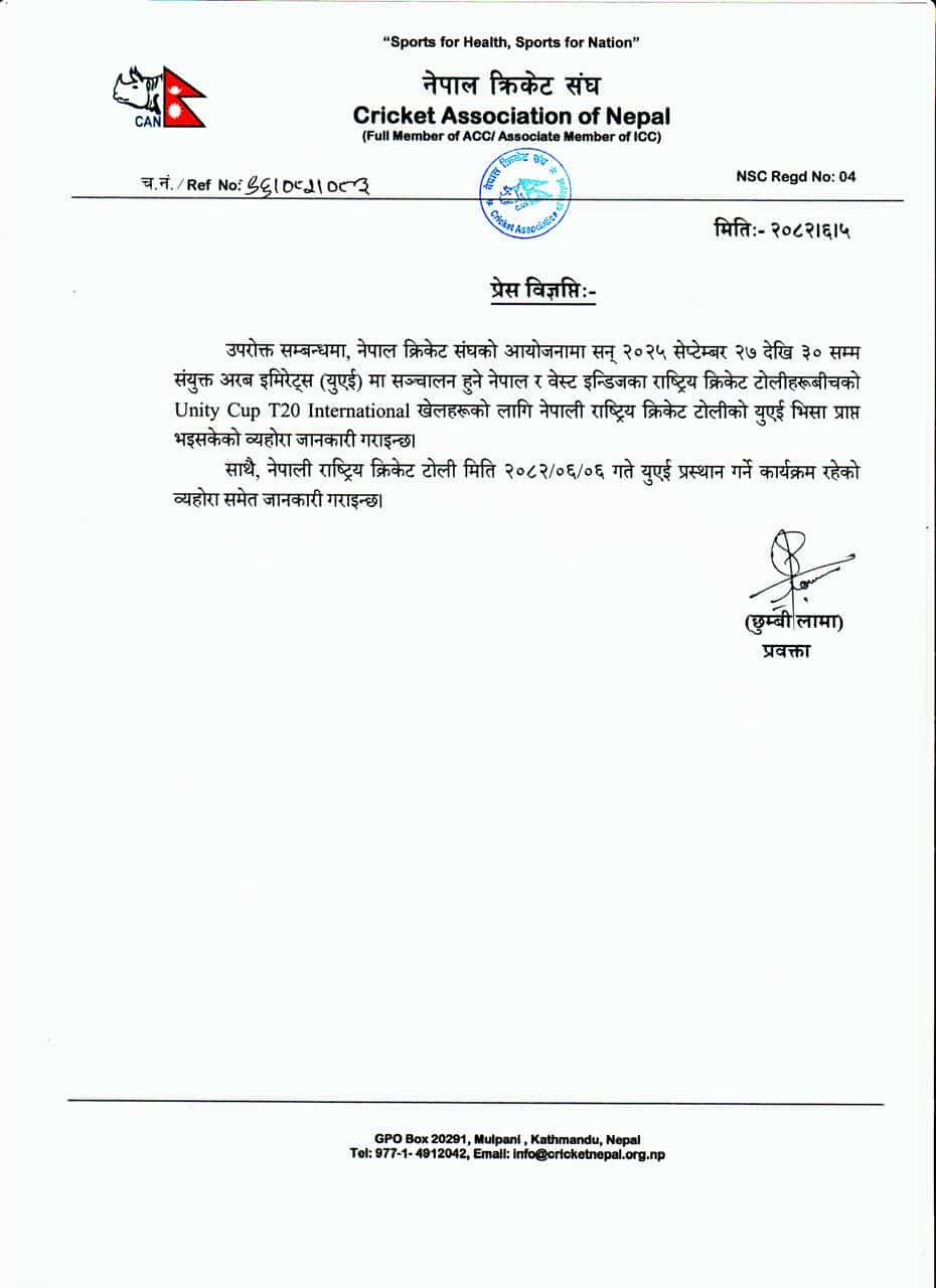 युएईले दियो क्रिकेट खेलाडीलाई भिसा, भोलि प्रस्थान गर्दै