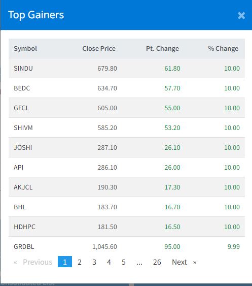 आइतबार कुल १३ कम्पनीको सेयर मूल्यमा सकारात्मक सर्किट लागेको छ । यस दिन आज सिन्धु विकास बैंक, भुगोल इनर्जी, गुडविल फाएनान्स, शिभम् सिमेन्ट, जोशी हाइड्रोपावर, अपि पावर, आँखुखोला हाइड्रोपावर, बलेफी हाइड्रोपावर लगायतका कम्पनीका लगानीकर्ताले सर्वाधिक कमाएका छन् । यस दिन ९ कम्पनीको सेयर मूल्य १० प्रतिशतले बढेकाे छ भने ३ कम्पनीकाे सेयरमूल्य ९.९९ प्रतिशतले बढेकाे छ ।