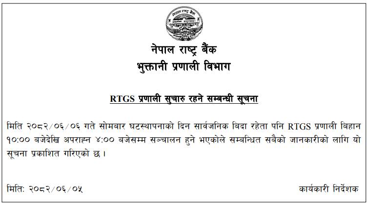 उक्त दिन बिहान १० बजेदेखि अपरान्ह ४ बजेसम्म आरटीजीएस प्रणाली सञ्चालन हुनेछ ।