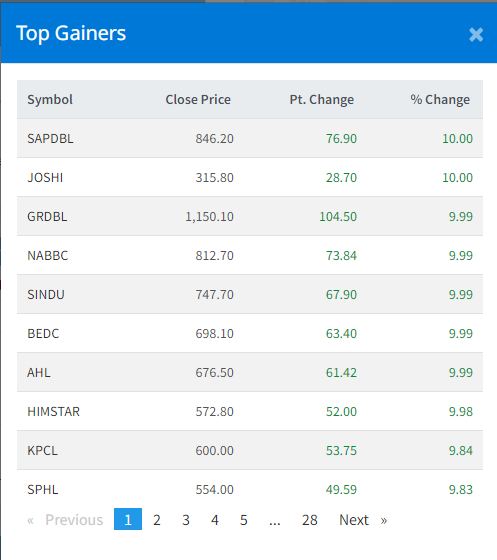 मंगलबार ३२८ कम्पनीको १ करोड १३ लाख ५३ हजार १४८ कित्ता सेयर किनबेच हुँदा ५ अर्ब ३१ करोड २७ लाख ७३ हजार रुपैयाँको कारोबार भएको छ । यस दिन सप्तकोशी डेभलपमेन्ट बैंक, जोशी हाइड्रोपावर, ग्रीन डेभलपमेन्ट बैंक, नारायणी डेभलपमेन्ट बैंक, सिन्धु विकास बैंक, एसियन हाइड्रोपावर, भुगोल इनर्जी डेभलपमेन्ट कम्पनी, हिमस्टार उर्जा कम्पनीको सेयरमा सकारात्मक सर्किट लाएको छ ।