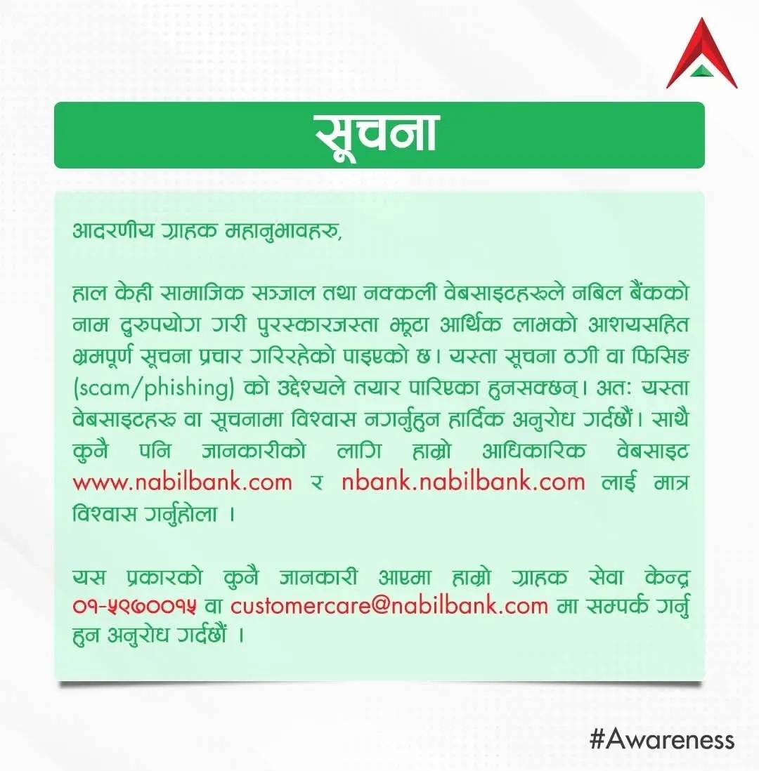 यस्ता भ्रामक सूचना वा वेबसाइटहरूमा विश्वास नगर्न आग्रह गर्दै कुनै पनि जानकारीका लागि केवल आफ्नो आधिकारिक वेबसाइट www.nabilbank.com र nbank.nabilbank.com मा मात्र भरोसा गर्न ग्राहकहरूलाई बैंकले अनुरोध गरेको छ।