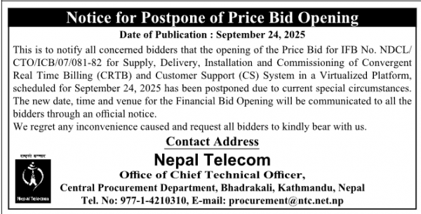 ​जेनजी आन्दोलनका कारण बुधबार प्रस्तावित मूल्य खोल्ने भनिएको मिति पहिले नै सारिएको थियो । तर, टेलिकमले अर्को सूचना जारी नभएसम्मका लागि मूल्य खोल्ने मिति पुनः स्थगित गरेको टेलिकमले सार्वजनिक सूचना जारी गरेर जानकारी दिएको छ ।