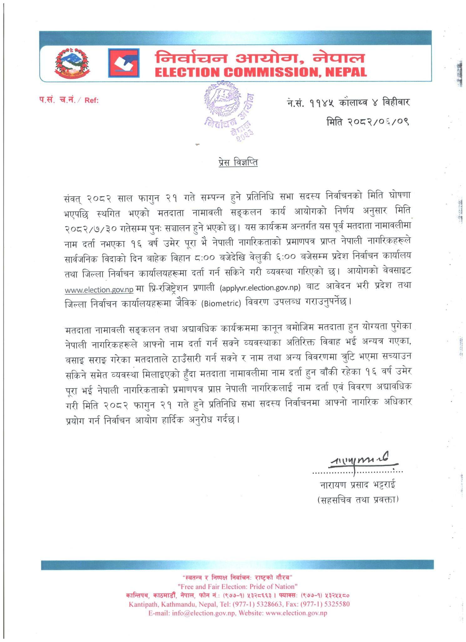 बिहीबार सहसचिव तथा प्रवक्ता नारायणप्रसाद भट्टराईले एक विज्ञप्ति जारी गर्दै शुक्रबारदेखि कात्तिक ३० गतेसम्म नामावली संकलन तथा दर्ता गर्न पाइने जानकारी दिनुभएकाे छ ।