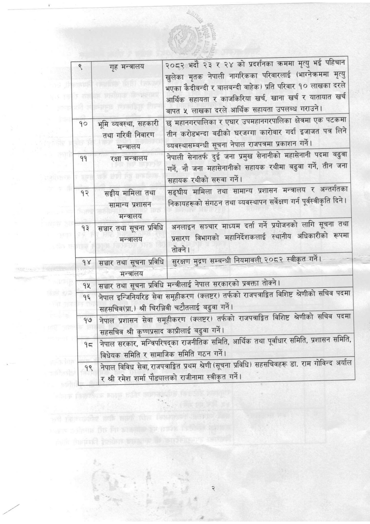 १० असाेज, काठमाडौं । बिहीबारको मन्त्रिपरिषद् बैठकका निर्णय सार्वजनिक गरिएको छ । सञ्चारमन्त्री जगदीश खरेलले शुक्रबार मन्त्रालयमा पत्रकार सम्मेलनमार्फत् मन्त्रिपरिषद् बैठकका निर्णय सार्वजनिक गर्नुभएकाे हाे ।